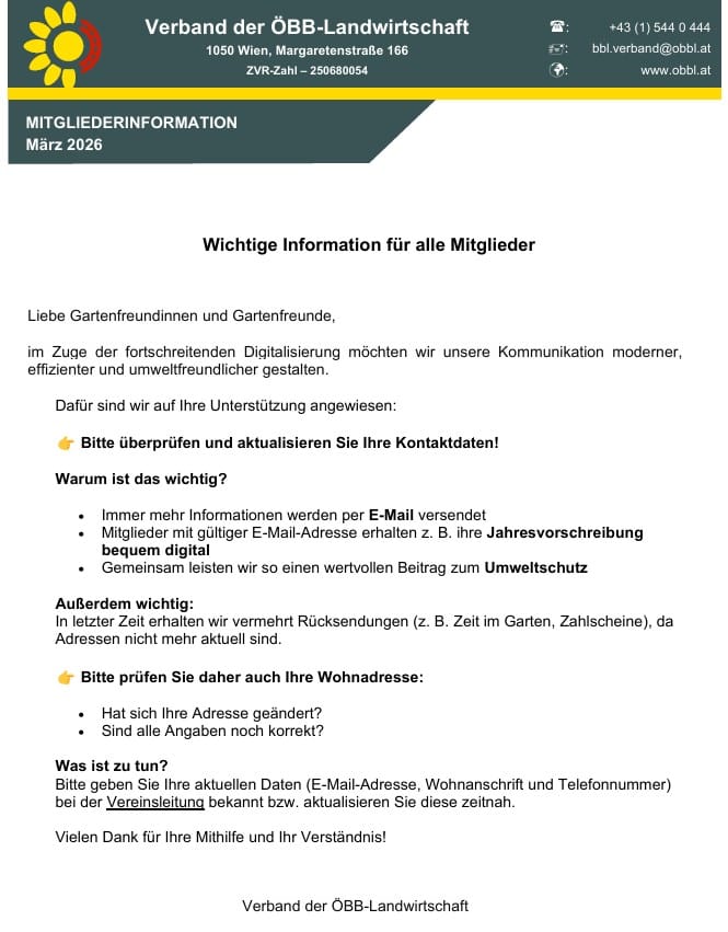 Mitgliederinformation - Aktualisierung der Kontaktdaten Kleingartenverein Strebersdorf 29. März 2026 Photo by AbsolutVision / Unsplash Mitgliederinformation KontaktdatenMitgliederinformation Kontaktdaten.pdf4 MBdownload-circle
